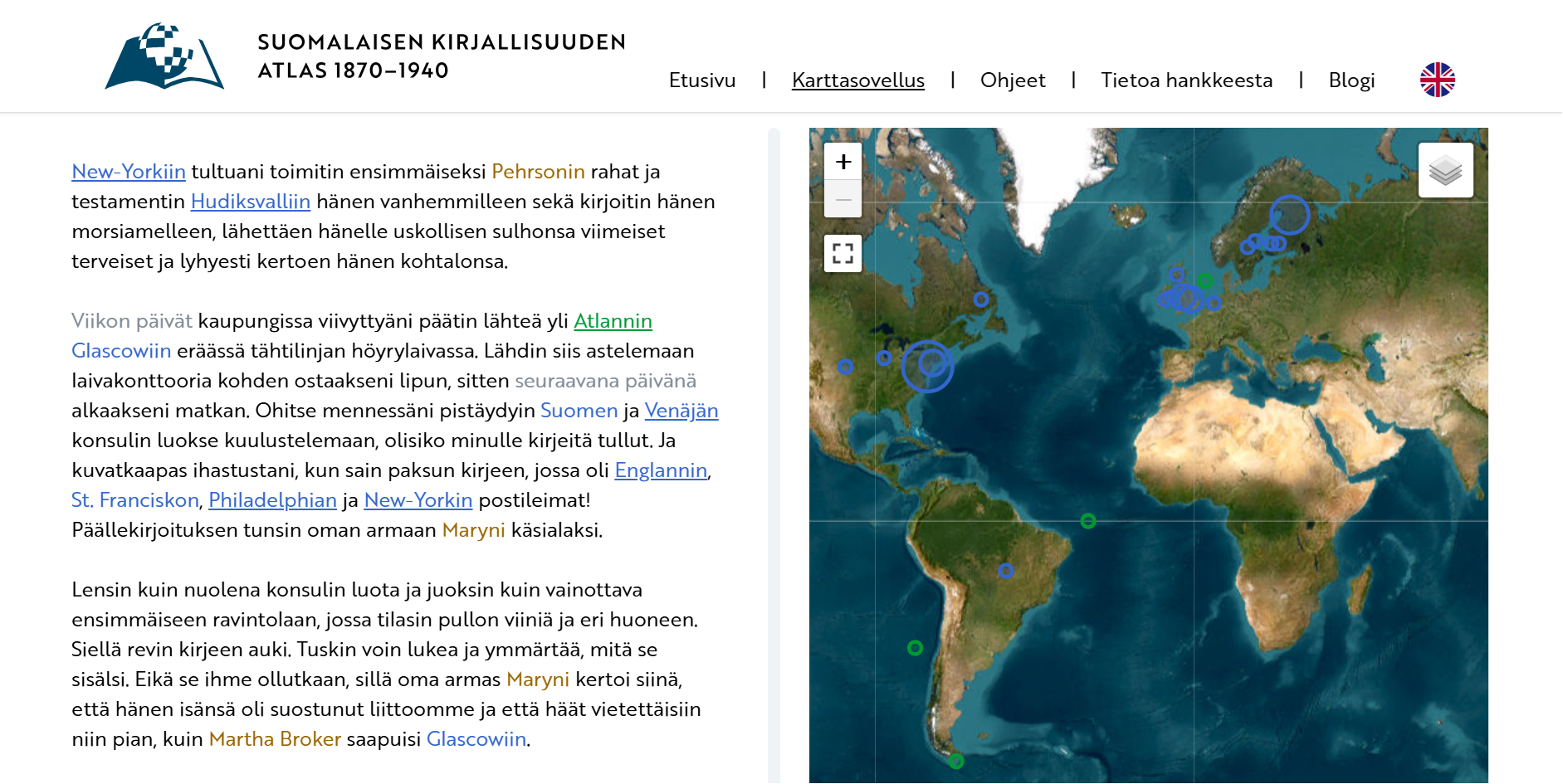 Kuvakaappaus Atlaksen verkkosovelluksen Merimiehen matkamuistelmia I ja haaksirikko -teoksen tekstinsisäisistä paikannimiesiintymistä.
