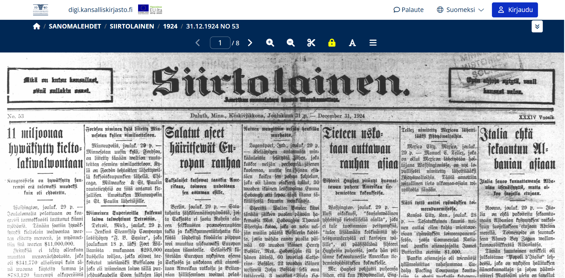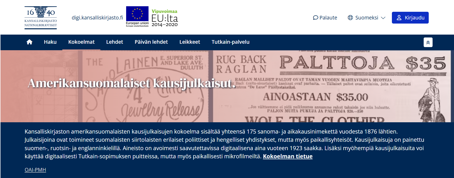 Amerikansuomalaiset kausijulkaisut Kansalliskirjaston digipalvelussa: https://digi.kansalliskirjasto.fi/collections?id=981